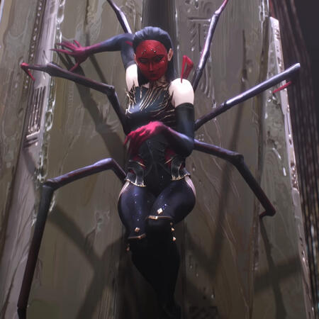 Counter is a spider hybrid. Weighing at 150 𖬺 having blue blood﹑ born with small spider limbs extended from her back .. they are covered in a magically strong armor shell﹑ with six legs growing in size lining her spine symmetrically. Two pediplaps from the shoulder blades - arched over her shoulders as extra protection around her nape. She stands at 5'5﹑ a comfortable height 𖬺 slimness to fit in small cases 𖬺 crevices.She has superhuman strength. More specifically in her calves. Contessa has a very strong tolerance for pain 𖬺 can withstand a good beating until she usually has no choice but to retreat or fall fatally. She usually refuses to retreat from anything she is set on.